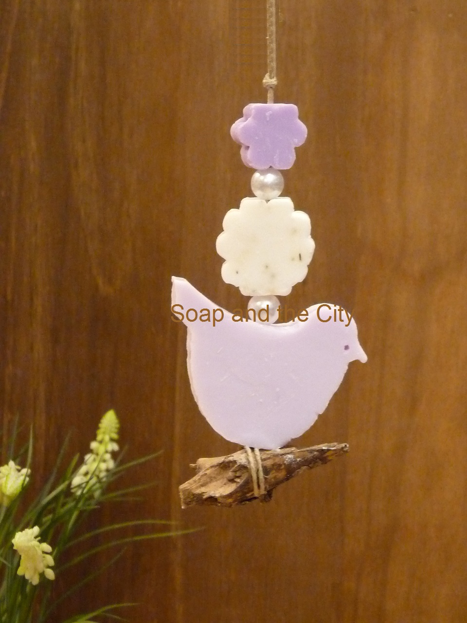 savons sculptés en poule et en fleurs, aux parfums poudre de riz et herbes