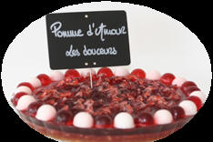 De belles griottes gorgées de soleil, quelques fleurs d'amandier sur un lit de pâte d'amandes amères adoucit de caramel vanillé.